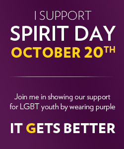 Millions of Americans wear purple on Spirit Day as a sign of support for lesbian, gay, bisexual and transgender (LGBT) youth and to speak out against bullying. Spirit Day was started in 2010 by teenager Brittany McMillan as a response to the young people who had taken their own lives. Observed annually on October 20, individuals, schools, organizations, and corporations, media professionals and celebrities wear purple, which symbolizes spirit on the rainbow flag. Getting involved is easy — participants are asked to simply “go purple” on October 20 as we work to create a world in which LGBT teens are celebrated and accepted for who they are.