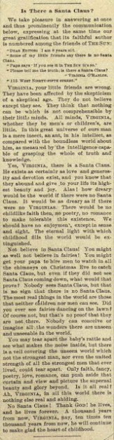 Yes, VIRGINIA, there is a Santa Claus. He exists as certainly as love and generosity and devotion exist, and you know that they abound and give to your life its highest beauty and joy. Alas! how dreary would be the world if there were no Santa Claus. It would be as dreary as if there were no VIRGINIAS. There would be no childlike faith then, no poetry, no romance to make tolerable this existence. We should have no enjoyment, except in sense and sight. The eternal light with which childhood fills the world would be extinguished.