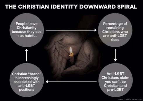 Unfortunately, the influence of LGBT-affirming churches is waning as their membership declines. Relatedly, research shows that increased Internet access — especially when used to access progressive media sources like Right Wing Watch and ThinkProgress — helps tighten the spiral of religious de-identification by consistently pointing out the link between conservative religions and politics.