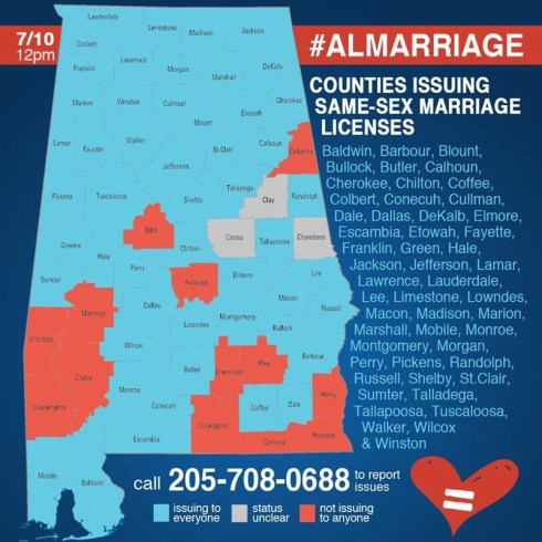 I had a conversation yesterday with the Campaign for Southern Equality, a small but diligent organization fighting for LGBT equality in the South. They contacted me since I had signed a petition for them earlier this year and asked if I would discuss with them the political climate of Alabama. I had a wonderful talk with Lindsey Simerly of CSE and have an even greater respect for their diligence than before, and I already respected them a lot. They are concerned about Alabama’s probate judges, and they want to help force them to comply. I personally believe that now is the time to push the fact that up to fourteen probate judges are not doing their job. I tried to check on one of the counties for them and see if they were issuing marriage licenses, but was unable to get a clear answer. What I did find out though is that their website says that the probate judges office is responsible for marriage licenses. If it is their responsibility then it sounds like an obligation that they are admitting to and not one that they “may” do or “may not” do. They even list the fees for performing weddings.