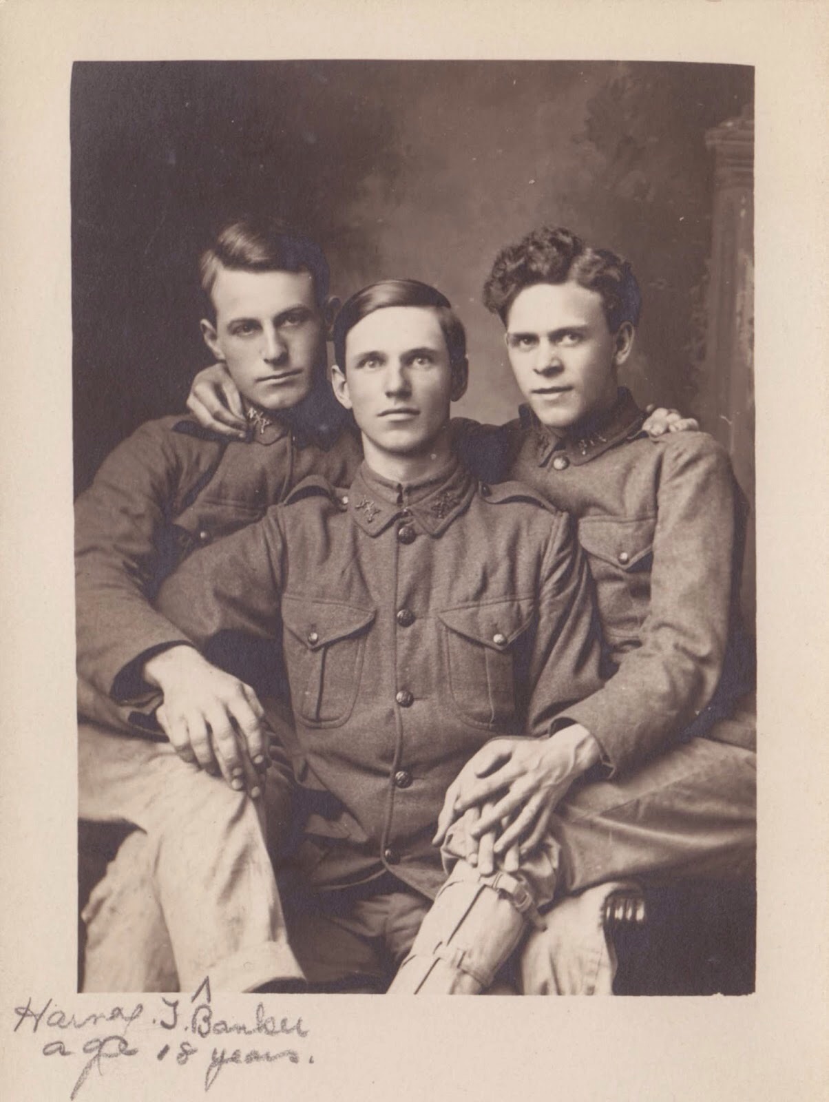 While I know nothing about this picture for sure, I am pretty sure of a few things. First, these men are from the early 20th century, most likely close to the time of the First World War. There uniforms are the uniforms that the US Army used between 1902-1926 as their winter service uniforms, at least the darker color of the shirts suggest that it is winter uniform as opposed to the lighter colored summer uniform. By the looks of the pins on their collars, I would say that they are part of a New York National Guard unit, but the picture isn’t clear enough to tell me what units. Furthermore, they seem to be very close to one another, good friends or possibly more, though they could just be brothers. One thing for certain, they were very handsome men, especially the first one on the left.