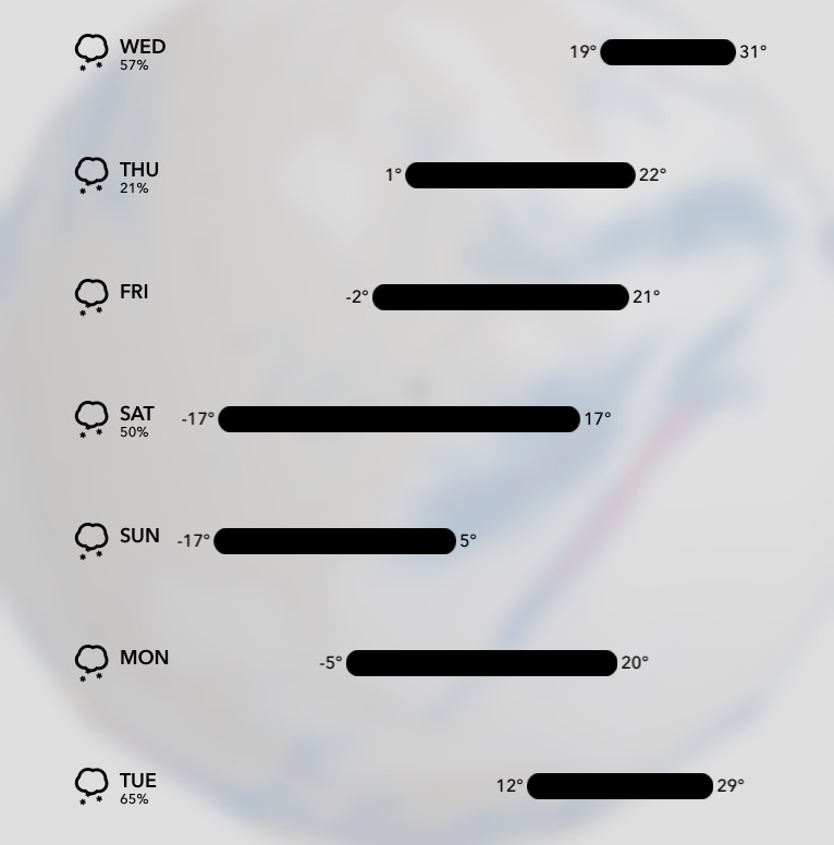 This week, things have begun to change. Apparently, we are finally getting the weather we should have had in November or December. Since Sunday we have gotten snow each day and the temperature continues to plummet. The news says we will be lucky to reach 0 degrees this weekend with lows between -20 and -10 degrees. The predictions I have seen are slightly better for the highs but it’s supposed to be windy so the wind chill will drop that quite a bit. This is what my forecast looks like: