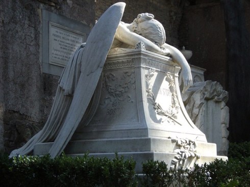 The above sculpture is called “Angel of Grief” and is an 1894 sculpture by William Wetmore Story which serves as the grave stone of the artist and his wife at the Protestant Cemetery, Rome.