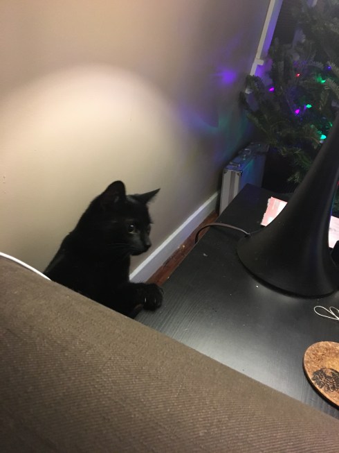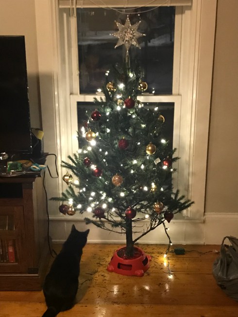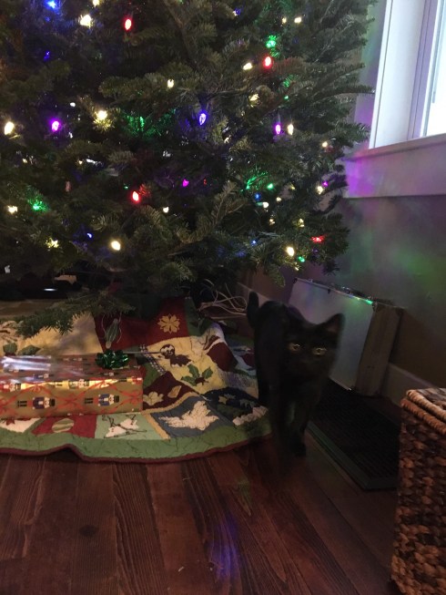 For the three years I have been in Vermont, I have not put up a Christmas tree. The first year was because one of my dearest and closest friends had just died, and I didn’t feel like celebrating Christmas. In fact, Thursday will be the three year anniversary of his death, and I am still heartbroken. I doubt I will ever fully stop grieving. The second and third year here in Vermont, I didn’t put up a tree because I told myself, why should I? I wouldn’t actually be here at Christmas. This year was something different though. Even though I will not be here at Christmas, there is no reason why I can’t enjoy a Christmas tree while I am home. Isabella seems fascinated by it. She’s played with the balls, sat under the tree, and pondered what the hell this thing is. She’s only ever seen a Christmas tree once before when she stayed at a coworker’s house over that first Christmas. She was a holy terror there, so she’s not welcomed back. It appears that my calm sweet cat just doesn’t like other people’s cats, so she went nuts. But she had some times of peace and wonder that Christmas like in the pictures below.