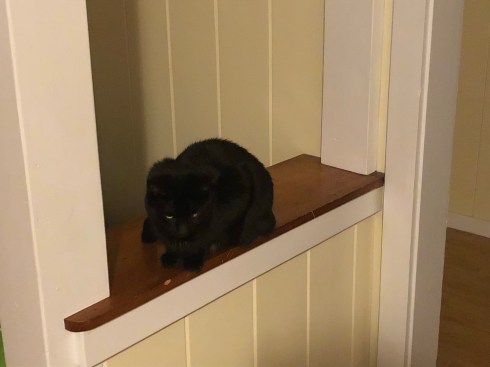 Poor Isabella was a bit traumatized by the movers. She hid in the box spring of my bed and was scared nearly to death when they tried to move it. I finally got her and shut her up in the bathroom where she proceeded to hide behind the toilet. When they left and I let her out, she promptly hid in the inner parts of my old couch that I’m getting rid of. When I got ready to take her to the new apartment, it was not easy getting her out of the couch and trying to get her in the cat carrier. It just served to traumatize her more. I finally got her in the cat carrier, which she did not like at all. When I let her out in the new apartment, she immediately hid. I tried to coax her out, but she just found a new place to hide. I finally picked her up and petted her head, and I knew then she was upset because she didn’t even fight me. She hates to be held. So I just let her alone to settle into her new home. After several hours, she finally came out and began very apprehensively to explore her new surroundings. By the time I went to bed, she had settled into her usual self and begging for head scratches. She ended up sleeping at the foot of the bed. I thought she’d finally settled in, but when I came home from work yesterday, she was once again hiding. However, as soon as I started cooking dinner, she came out and was out and about for the remainder of the night. I’m guessing it will take her a little while to get used to her new home. She’s found a favorite perch though:
