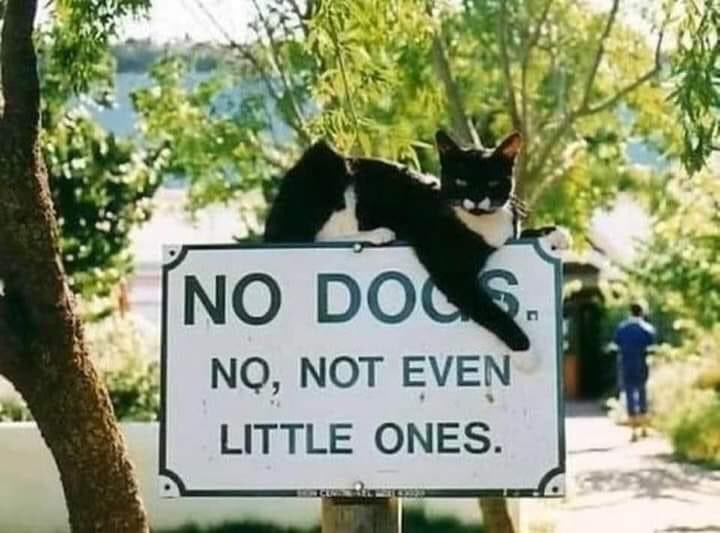 There are basically four types of people in this world: cat people, dog people, those who like cats and dogs, and those who don’t like pets. I fall squarely in the cat people category. I do not like dogs. Sometimes, I can tolerate them, but they still make me nervous. I have been afraid of dogs most of my life. I was traumatized by one as a child, and I’ve never been able to get over it. I don’t like dogs. I don’t like the way they smell. I hate to hear them bark. I can’t stand for one to lick me or slobber all over me. I absolutely despise when I tell someone I don’t like dogs and have been afraid of them since I was a child and they to respond, “Oh, but you’ll like my dog. He’s so sweet and lovable.” No, I am not going to like your dog. I may tolerate him, but I’ll never be comfortable around him. I just wish people could understand that and not get offended. I had a boss once that found it hilarious that her dozen little dogs would jump all over me, and she was convinced that her dogs were the exception to my feelings about dogs. They were not, and it was absolute torture every time I had to go to her house. So, as the sign below says, “NO DOGS, NO NOT EVEN LITTLE ONES.”