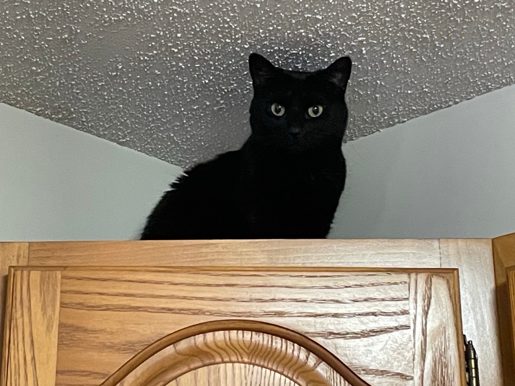 And here is my own personal alarm clock, Isabella, looking down on me from the top of my kitchen cabinets while I cook dinner.