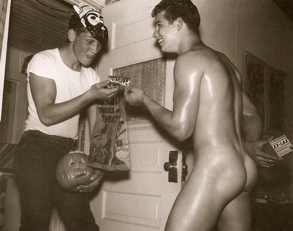 Considering what he’s wearing, it could be both, but also, considering what he has behind his back, it’s probably more TRICK than TREAT.