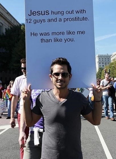 We cannot return that hatred as retribution. In Matthew 5:38-40, Jesus says, “You have heard that it was said, ‘Eye for eye, and tooth for tooth.’But I tell you, do not resist an evil person. If anyone slaps you on the right cheek, turn to them the other cheek also. And if anyone wants to sue you and take your shirt, hand over your coat as well.” Jesus goes on to say in Matthew 5:43-44, “You have heard that it was said, ‘Love your neighbor and hate your enemy.’ But I tell you, love your enemies and pray for those who persecute you.” I remember back in graduate school the hate group that call themselves Westboro Baptist Church came to my campus to protest and shout obscenities to those who they deemed unworthy of God’s love. A lot of people on campus staged a counter protest and engaged with these hateful people. I always felt that there was only one response to hate groups like Westboro Baptist Church, and that is to kneel and pray that God would deliver them from evil and show them the ways of His love. So, as I passed by, I stopped and said a prayer asking God to show them the light of his love. In my opinion, the best way to combat hatred is through love. If we show our love to those who hate us, then we are living by example, and isn’t that what Christianity is about? We are supposed to live by the example that Jesus set forth for us when he walked the earth. I have often seen the picture below of a gay man holding up a sign that says, “Jesus hung out with 12 guys and a prostitutes. He was more like me than you.” I’ve always loved that thought, because Jesus did live the way he wanted us to live.