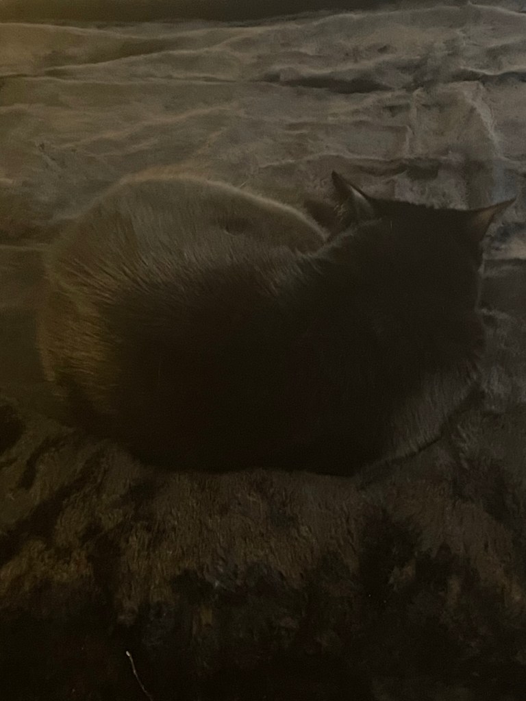 She’s been curling up on a black blanket lately—so well camouflaged that I nearly jump out of my skin every time the blanket moves. It’s her own personal cloaking device. Somewhere, a Romulan engineer is taking notes. 🖖🐾