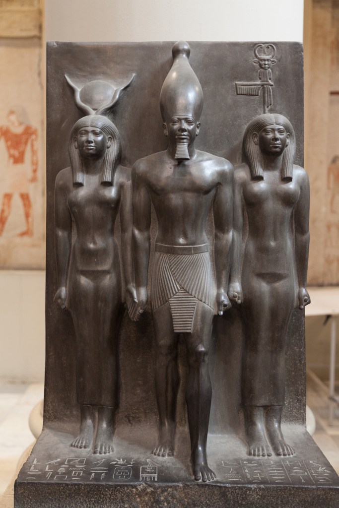 - Statues of Menkaure (Mycerinus) with Hathor and Nome deities (c. 2490 BCE) – Museum of Fine Arts, Boston.