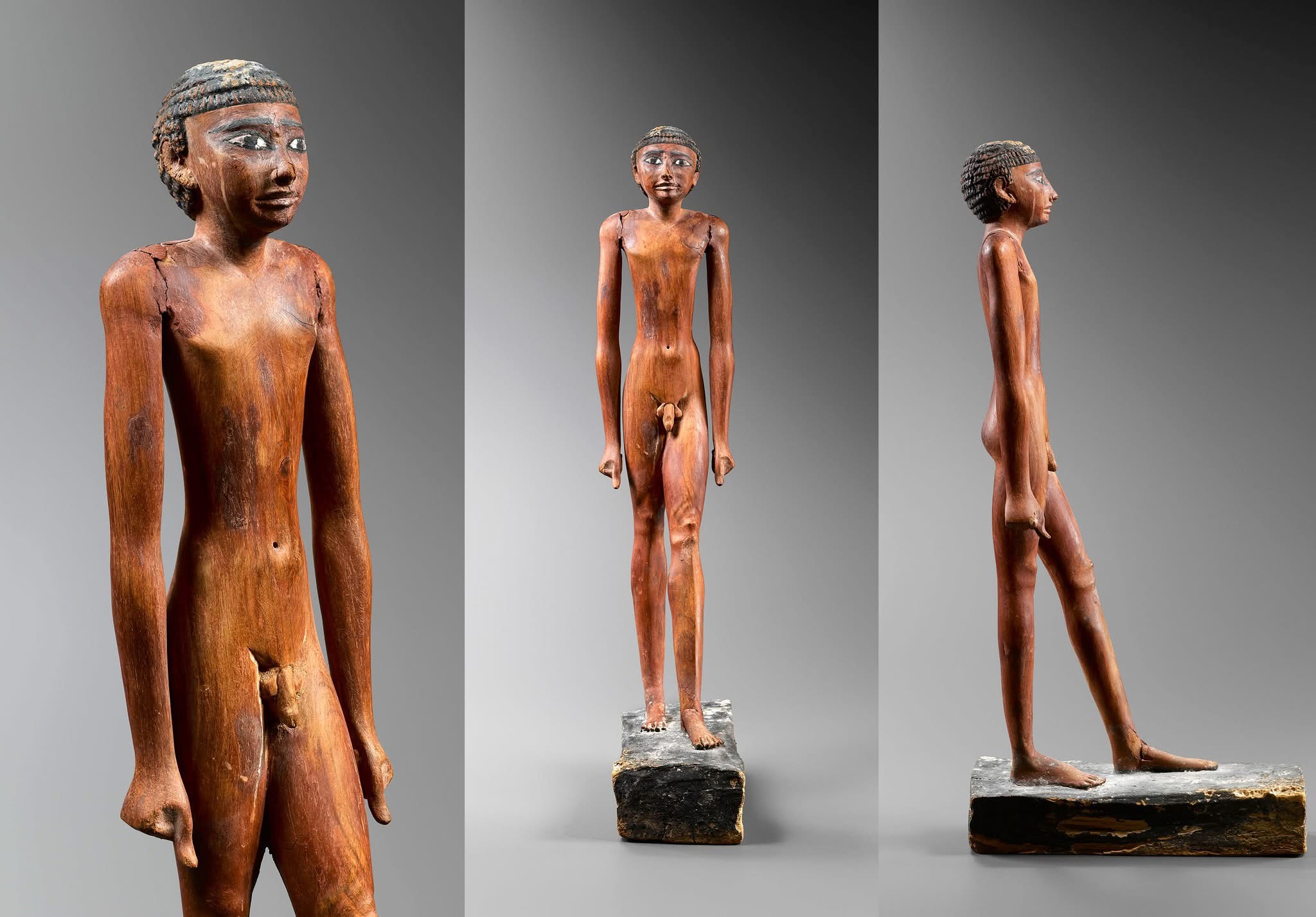 Sculpture also embraced this frankness. A striking wood and plaster figure from the Teti pyramid cemetery at Saqqara depicts a naked man, his body rendered with a simple, direct realism. Nudity here communicates not shame, but the humanity and vitality of the subject.