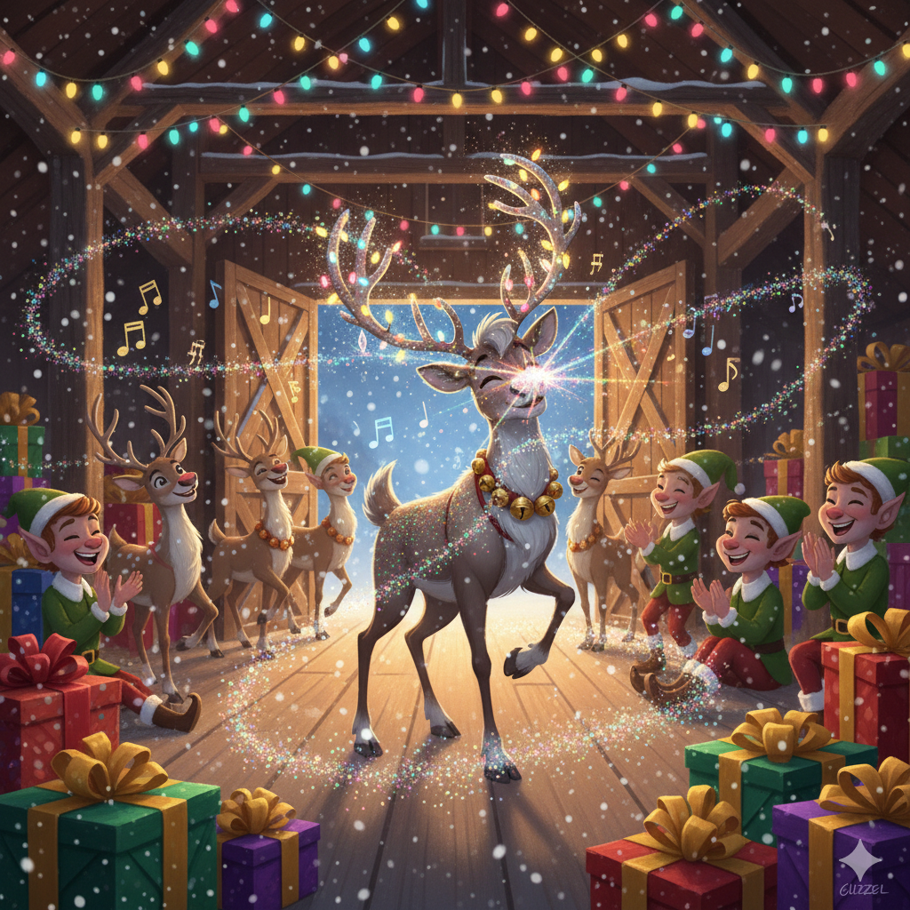 Following the sound, Santa entered the reindeer barn and was greeted by a truly fabulous sight. A group of young reindeer were dancing and singing, led by a buck with glitter on his nose and a string of lights woven through his antlers. Bells jingled as he moved, creating the most wondrous music, and everyone present was clearly delighted.
