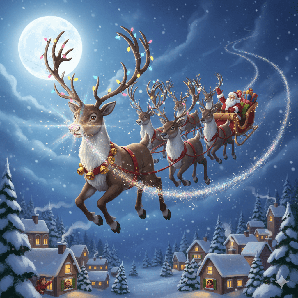 On Christmas Eve, Glitzen led Santa’s sleigh, flying proudly at the very front. As they soared across the world, glitter and light rained down upon cities and villages alike. And something remarkable happened.