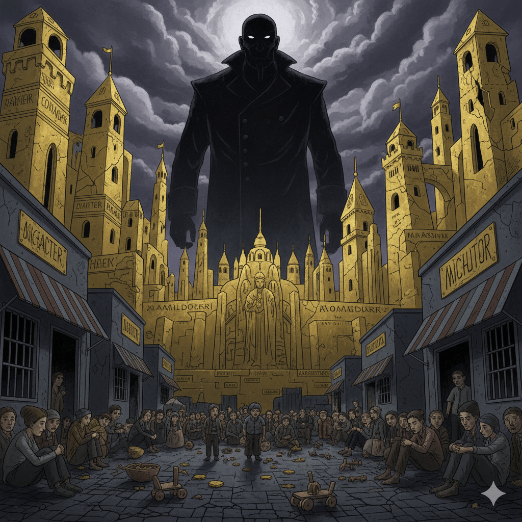Across the Earth, a cruel and crooked dictator had risen to power. He ruled by fear, lies, and greed, demanding that the world worship him and his avarice above all else. He renamed cities, buildings, and institutions after himself, insisting his name be spoken everywhere, carved into stone and stamped in gold. Vast, glittering monstrosities were built in his honor—towering, hollow things—constructed by draining money, food, and comfort from ordinary people who could scarcely afford to lose any more.