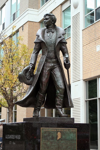 lThe bronze sculpture, created by Del Newbigging, depicted Wood in early-19th-century attire—not a military uniform, but the formal dress of a gentleman of his era. His pose was confident, with one hand tucked behind him and the other holding a walking stick.