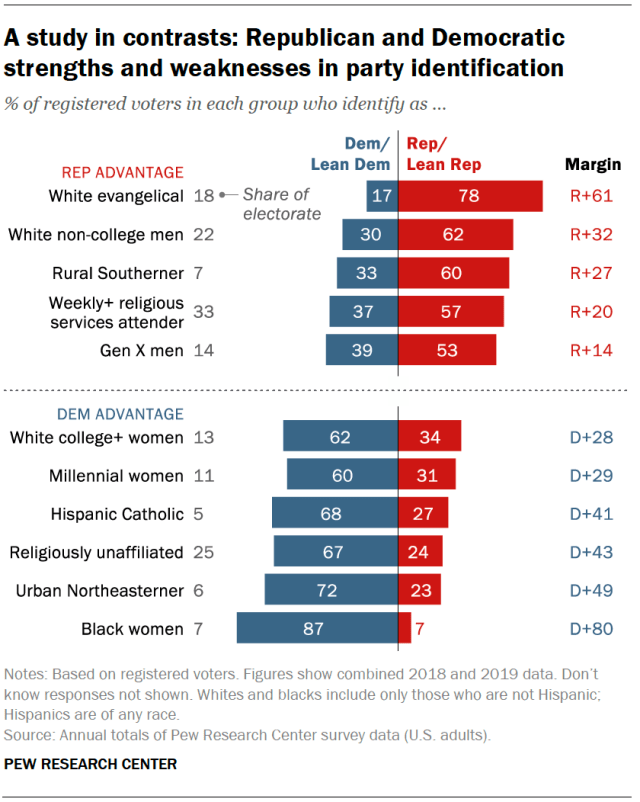 According to the Pew Research Center, Democrats hold advantages in party identification among blacks, Asians, Hispanics, well-educated adults, and Millennials. Republicans have leads among whites – particularly white men, those with less education, and evangelical Protestants – as well as members of the Silent Generation. Just 36 percent of registered voters have a four-year college degree or more education; a sizable majority (64 percent) have not completed college. Democrats increasingly dominate in party identification among white college graduates – and maintain wide and long-standing advantages among black, Hispanic, and Asian American voters. Republicans increasingly dominate party affiliation among white non-college voters, who continue to make up a majority (57 percent) of all GOP voters.