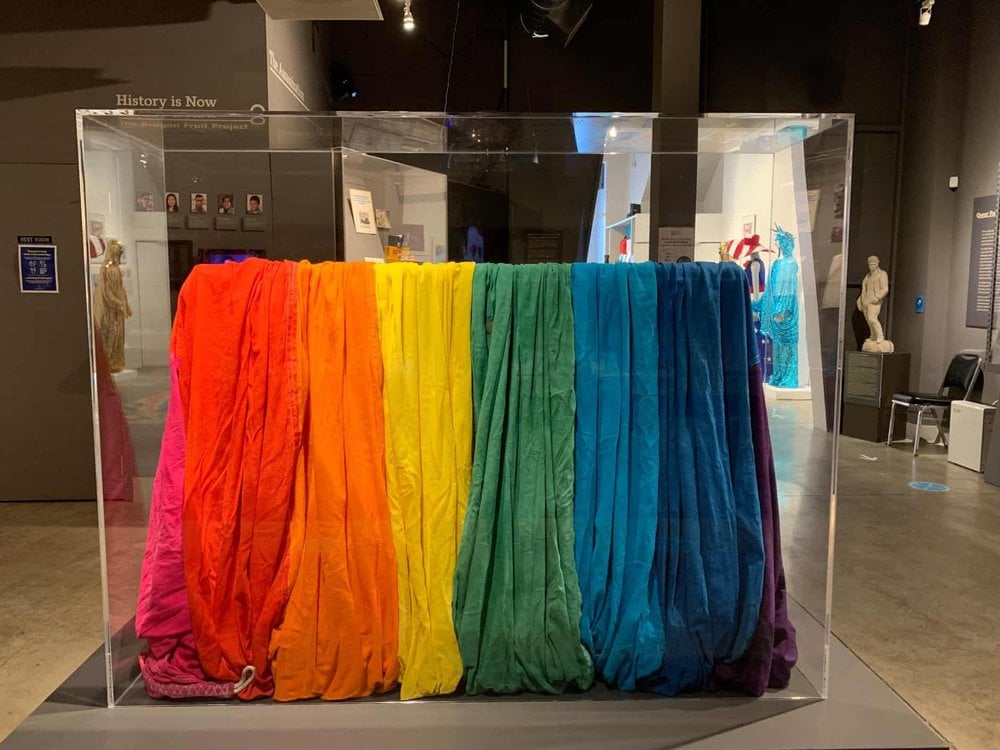 Despite their outsized global impact, the two original flags were thought to be lost for more than four decades. One flag was stolen from a community center and never recovered. But Baker managed to quietly rescue a 10- by 28-foot segment of the second flag, which had been placed in storage after sustaining water damage. Baker took the item with him when he moved to New York City in 1994. After Baker’s death in 2017, the flag and his other belongings were shipped to his sister, who later passed the fragment along to Charley Beal, president of the Gilbert Baker Foundation. Beal did not realize he was in possession of the original 1978 banner until early 2020, when a vexillologist (or flag expert) examined the item firsthand and confirmed its provenance. In June 2021, the GLBT Historical Society Museum unveiled a glass case containing this rare artifact: a segment of the original rainbow gay pride flag, its colors as vibrant as ever.