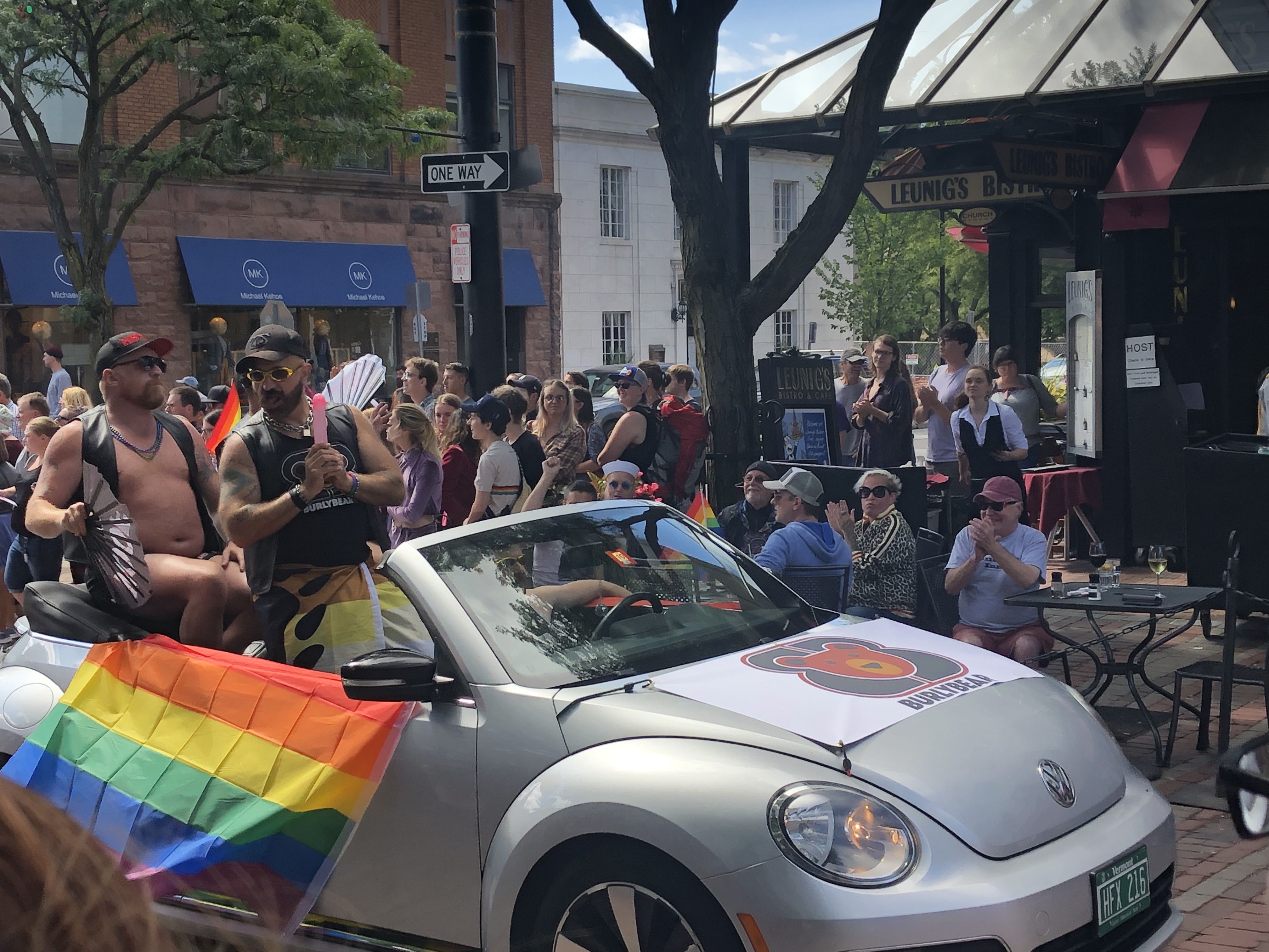 Sunday was the big day. It was the day of the parade. A huge crowd turned out for it. The streets were lined several people deep. There was no rhyme or reason to the order of the people who marched. Probably the largest contingent of people were from St. Michael’s College, a small Catholic college of less than 2000 students, who probably had more than a hundred students there including the hockey team. My favorite queens, Nikki Champagne and Emoji Nightmare we’re in the parade. (See the first picture.) They had hosted the Ball the night before. The LeMay Sisters were at the restaurant across from me but did not march this year. There were some strange participants such as the Star Wars group and the Hearthlight group who were dressed as medieval women. The Burly Bears were there along with many other groups. Ben and Jerry’s always has a group in the Parade as does Bernie Sanders, whose people seemed to be handing out chunks of carrots. It’s definitely a unique parade.