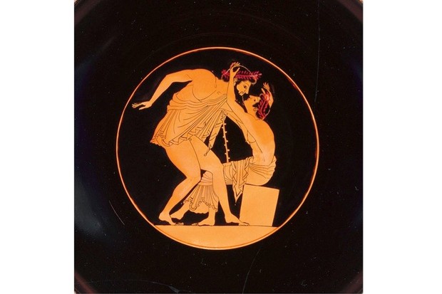 An Athenian red-figure kylix (cup) dating from around 510–500 BC depicts a young pentathlete pulling his older lover towards him for a kiss. In many of the city-states of ancient Greece, sex between a man and a youth was an accepted – even idealized – form of love, its virtues extolled in works by writers including Plato.