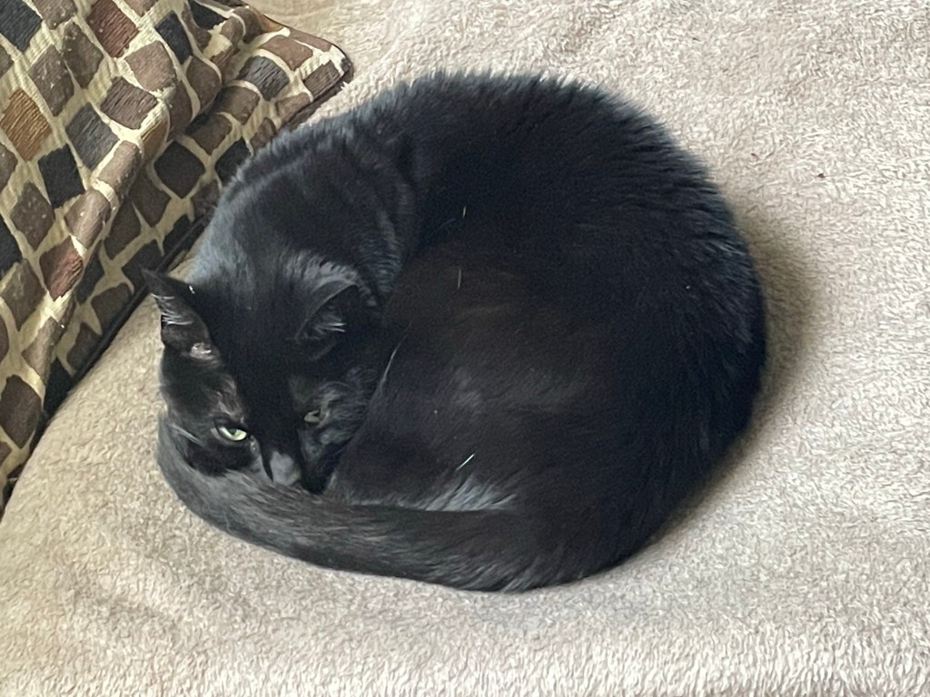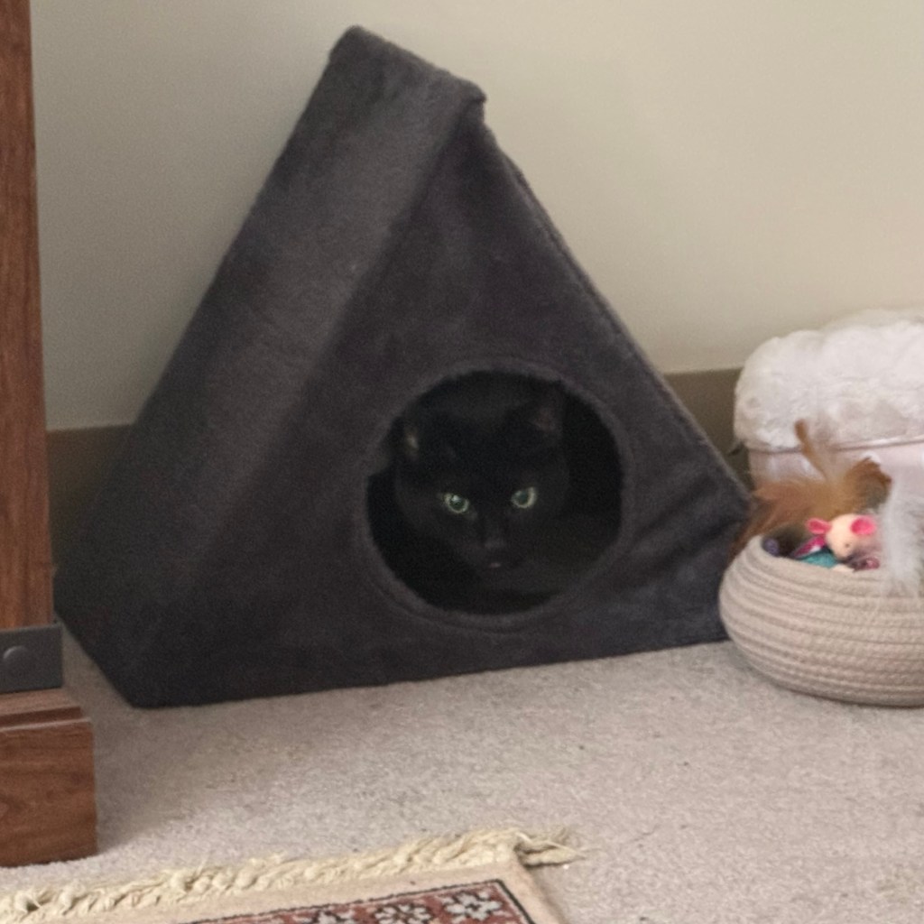 Anyway, I wish I could just stay home and snuggle up with Isabella. She seems to always find a warm place to nap. The other day, she finally discovered a place that I’ve wanted her to try out for years. Several years ago, I bought her a little cat house, which she has always ignored. The most she has ever done is stick her head in and turn around and walk away.I also bought her a nice cozy looking, fluffy cat bed, which she has never even contemplated using. She prefers a fuzzy blanket. The other day, I looked up, and she was in the little house I’d gotten her. With her eyes closed, you could barely notice her, so I made a noise to get her to open her eyes. I took the opportunity to take the picture below. It apparently pissed her off that I saw her in there, and she crawled out and stomped off never to return again. Such a stubborn little girl!